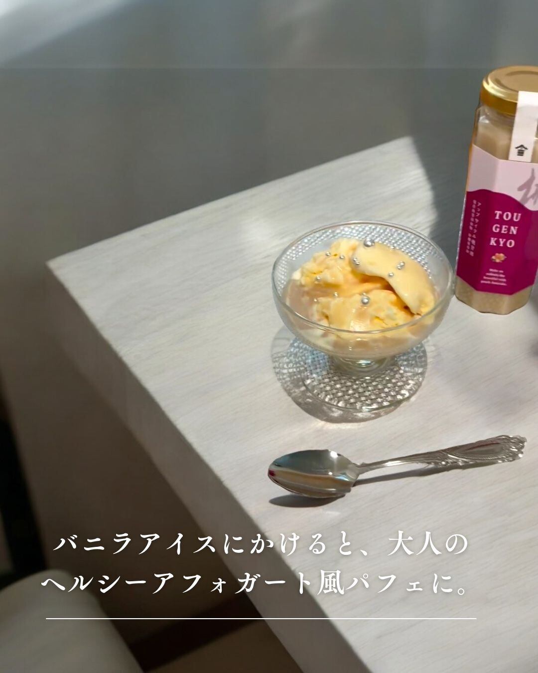 バニラアイスに冷やした桃甘酒をかけると、大人のヘルシーパフェに。