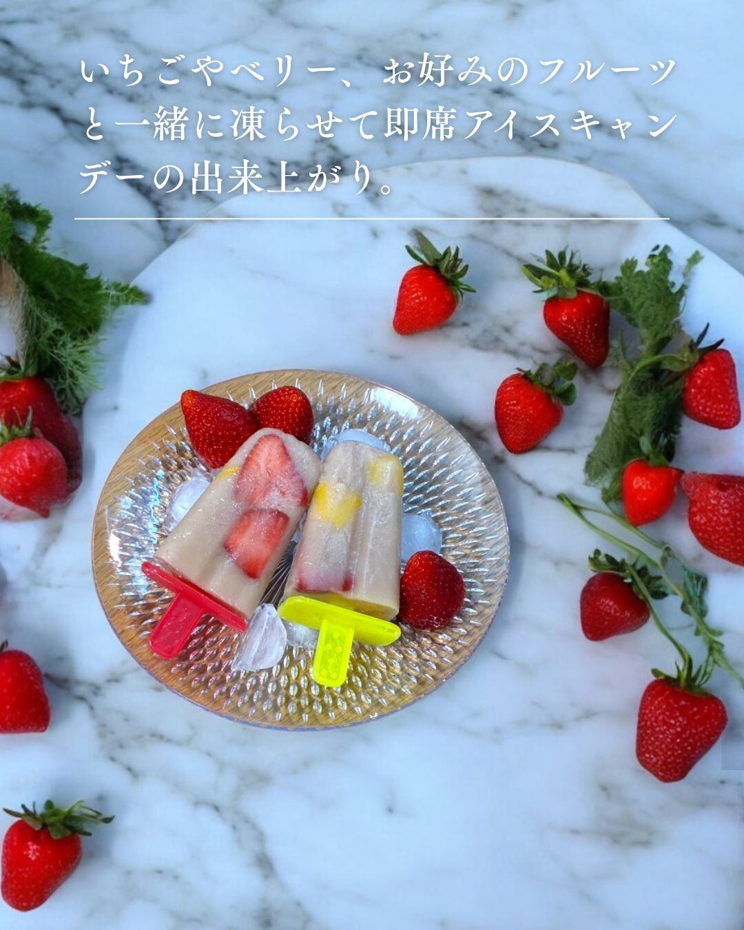 お好みの果物と一緒に冷凍庫で凍らせると甘酒フルーツアイスになります。夏にぜひお子様と一緒に作ってみてくださいね。